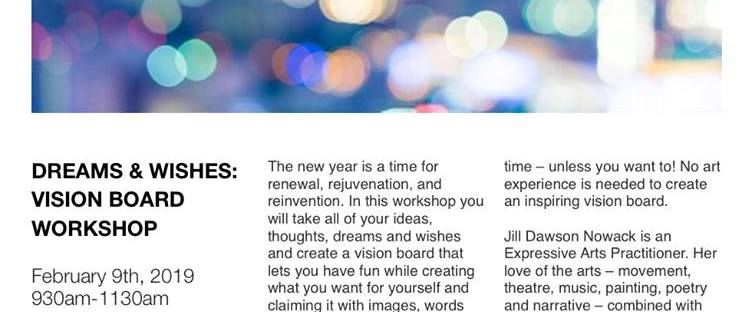 Join Jill Dawson, Expressive Arts Facilitator, on February 9th from 930am-1130am for a FREE Vision Board Workshop.