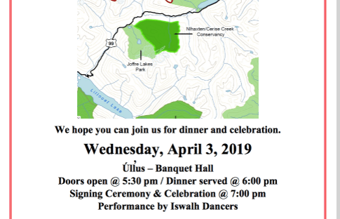 The Lands and Resources Department invites you to join in celebration and dinner to acknowledge the signing of the Nlháxten Creek Conservancy Plan – on April 3, 2019.