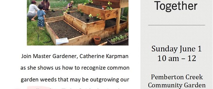 Belinda Geisler, the new Settlement Coordinator for Pemberton Settlement Services (formerly known and still on Facebook as the Pemberton Multicultural Network), must be reading my mind. There are a lot of things sprouting in my garden that I don’t recognize and am not sure if I planted. Maybe they’re volunteers! maybe they’re weeds! Maybe they’re those flowers I forgot about! Maybe my kid planted them! There are so many variables. The only thing I know, when I stand there, scratching my head, and looking at them, is the Life Force is strong in them. To survive in my garden, under my care, that is necessary. So I am always loathe to pluck them out. Plucky little things. Which is why the newest gardening offering from Pemberton Settlement Services, to be hosted at the Pemberton Creek Community Garden, could change my life. Master Gardener Catherine Karman will explain how to recognize common garden weeds! You can also help planting the Global Garden. Sunday, June 1, from 10am – noon.