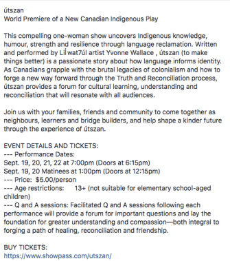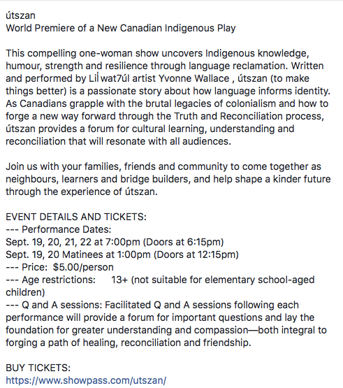 Screen Shot 2019-09-01 at 10.29.22 PM Previous Next Published September 9, 2019 at 491 × 555 in One woman show by Lil̓wat7úl artist Yvonne Wallace debuts in Whistler, September 19 -21. Tix just $5!