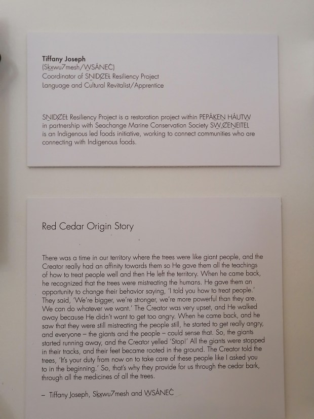 She said that the trees used to get so big that 30 people could stand around it holding hands and sometimes even then you might not reach all the ways around. Those trees, she said, were like our great great great great grandmothers. I really love that. I remember being told that when we prayed before harvesting Cedar, we would say a prayer offering thanks for letting us borrow her dress. I believe I am who I am because the women in my life, the women who have been in my life, and my ancestors. I am so grateful to be Lil’wat and have been surrounded by so much love and nurturing. I called my mom before I started writing and asked for advice and she told me to hold a bit of cedar. She is so wise and taught me well on lessons of loving Land. I am so grateful to have such a strong mother. I pray more people can feel the love that we do for Cedar. I pray for people to have that relationship with Land. I want to end this by sharing this poem that was up at the exhibit.