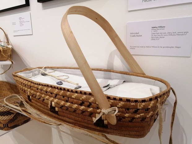 Last week I attended the opening celebration for an exhibit at the University of Victoria’s “We Carry Our Ancestors” exhibit. The moment I walked in I felt the beautiful energy from the baskets. I could feel all the love that went into making them. Dr. Lorna Williams was there and shared some words of thanks to the people who contributed to the exhibit and shared some Lil’wat knowledge of baskets, and the trees. She has generously loaned her family’s baskets to the exhibit, including this tsepalín.