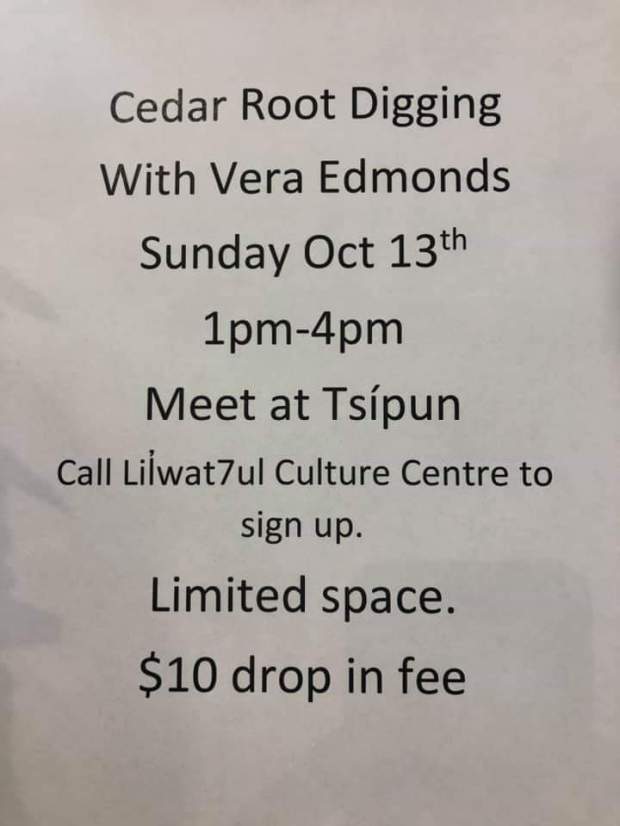 Join Vera Edmonds on October 13th for Cedar Root digging. This is a wonderful opportunity to share an ancient tradition that has been kept alive all this time by our Elders like Vera. Baskets continue to have an important role in our communities today. Getting to know cedar is like getting to know and love who we are. We are in relation with the land, with cedar trees and we have roots that keep us strong!