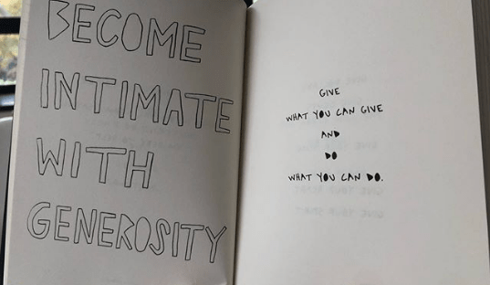This graphic, from a book by Cleo Wade, made me stop for a second and think about generosity. I’d heard a teacher say, when explaining how to approach a new challenge, a new learning, “be generous with yourself.”