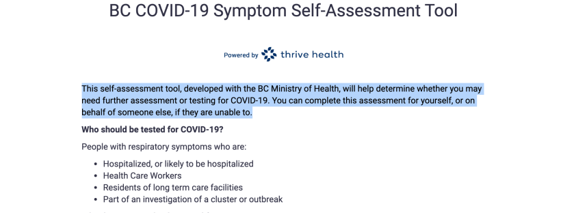 To avoid overwhelming our health care system – which is, let’s face it, one of our current most urgent priorities – the BC Ministry of Health has developed an online self-assessment tool, to help determine whether you may need further assessment or testing for COVID-19. You can complete this assessment for yourself, or on behalf of someone else, if they are unable to.