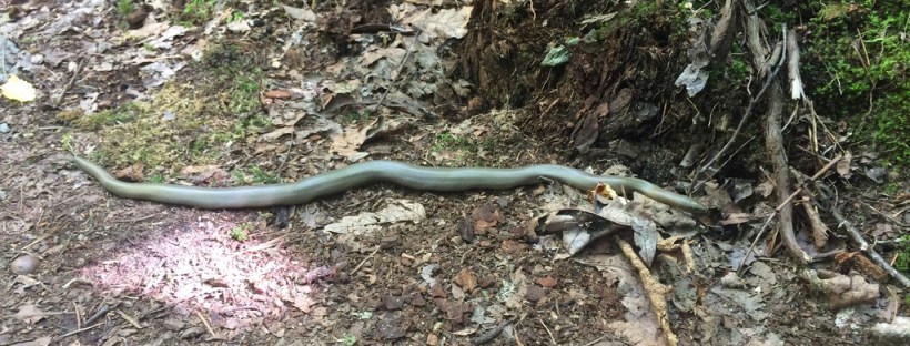 6 weeks later, on my bike, pedalling up hill, a snake lies across the trail. This time, it is a rubber boa, a rare gentle creature, an even less likely encounter, and I remember what not to do. I do not ask her for her message, I do not grasp psychically for significance and meaning, I do not assault her with all my desperate questions and attempts to be in relationship and all my presumptions that my thumbs and legs are really all that special. I lean my bike against a tree, squat down on my haunches, and say, “hello, what a true pleasure it is to encounter you today.”