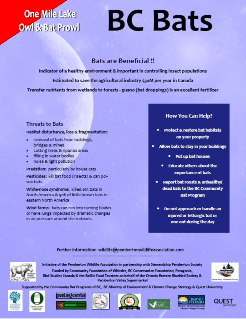 The attached report, Bat Conservation Pemberton: Understanding, Appreciating, and Stewarding Bats in Pemberton, BC, was produced by Greg Ferguson, in partnership with the Pemberton Wildlife Association and Stewardship Pemberton Society, with thanks to the Community Foundation of Whistler, BC Conservation Foundation, Pemberton Valley Supermarket, Quest University, BC Ministry of Environment and Climate Change Strategy, BC Community Bat Program, Wildlife Conservation Society of Canada, and several landowners that supported survey work, volunteers that helped with project activities, and community organizations and businesses that supported outreach and education.