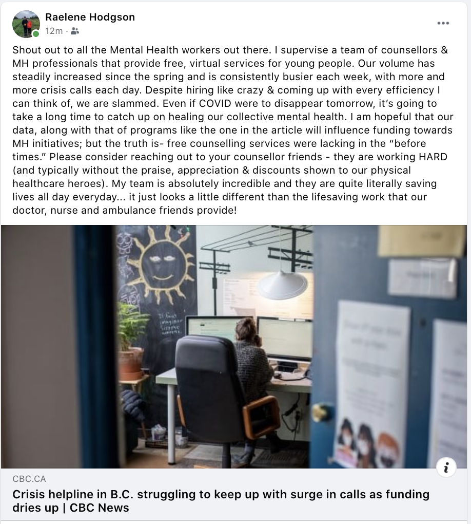 One of my favourite mental health professionals is the owner of local yoga studio, Village Yoga, Raelene Hodgson. She recently shared this important reminder that crisis calls are increasing, every day, and that teams of counsellors are doing life-saving work, every day.