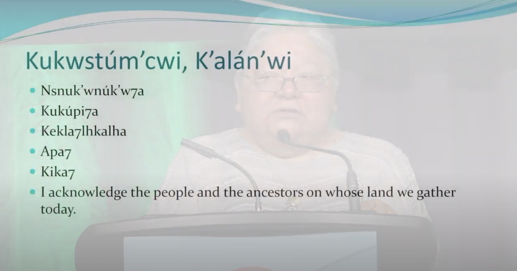 I know you have that word in your language. pál7altsem, in my language is to visit, to go and have a cup of tea with somebody. To go and just sit on the porch and visit, to tell stories, to reminisce, to laugh and joke, to be with one another. Had we not had that, I may not have recovered from my experience in residential school, but it’s because people would come together in such an uplifting way, such a caring way, that we’ve been able to overcome all of those experiences. So I want to encourage you. To bring language back, we need to pál7altsem, to visit one another, to spend time with one another and in our communities we need to be able to do that.