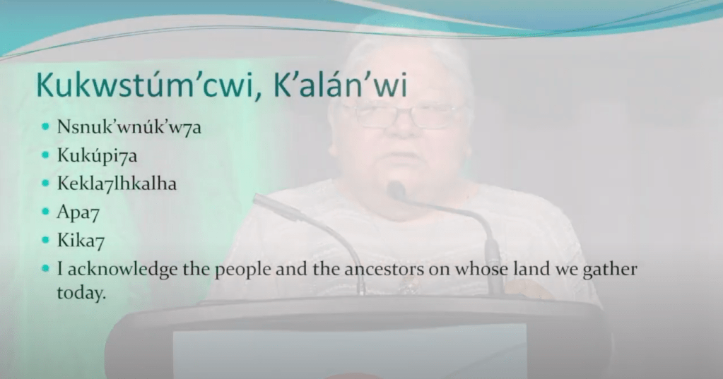 When we bring our language, to those activities, to those ways of being, [to our cultural practices and our ways of being with the land] it helps us to understand and to appreciate the beautiful beautiful ways in which we see the world. It’s the way that we name he world. That we realize our uniqueness. When I began my talk, I said that I was happy that you’ve come together and I used a particular word that I always teach my students… and that word is kamecwkalha. (Listen to the video at 24:39 to hear Dr Williams says this word.)