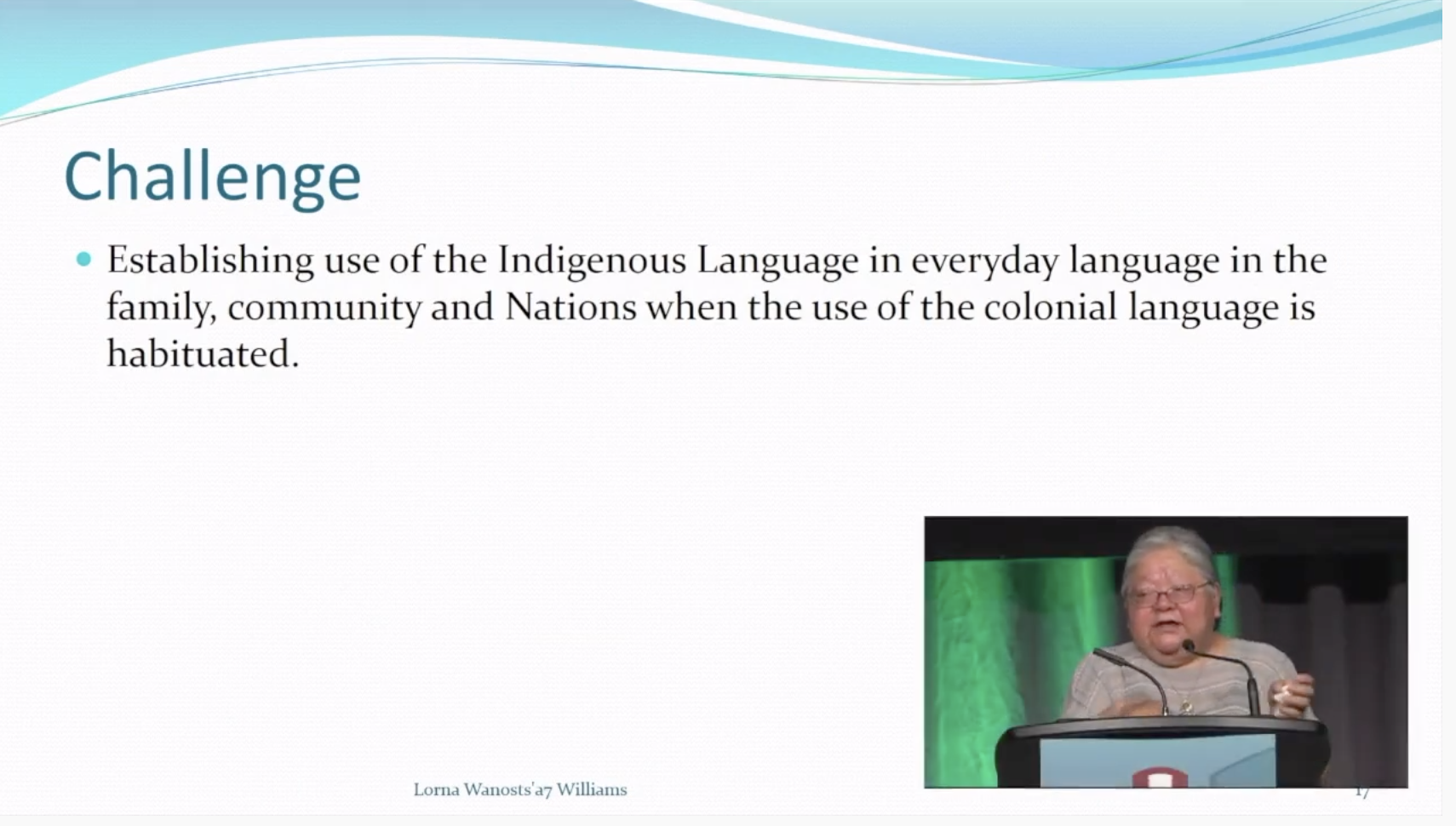 We live in a world where we’re habituated to live in a colonizers’ language. So, to bring our languages back to every day use, we need to be imaginative, we need to be courageous, we need to be persistent in being able to create those spaces within our families. And that’s a huge challenge, because of the world that we live in, to be able to speak our language, to be able to hear our languages, and to be able to hear those, in our families that often are broken apart, where members of our families live far away, where we come into the habit of not visiting.