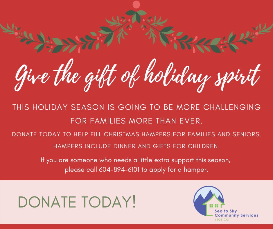 There are a few lovely invitations floating around right now, that might provide a way of having an impact in the community and beyond, initiated by and for local families. You could donate a gift card to kids who will be spending their Christmas at the BC Children’s Hospital through Super Ty’s 5th annual Toy Drive. You could contribute to the GoFundMe to offer a little bit of support and a fierce wave of love to Kevin Damaskie and his family. You could make a contribution to the Christmas Hamper program for families and seniors, being put together by Sea to Sky Community Services. Or contribute to the Food Bank that supports your community.