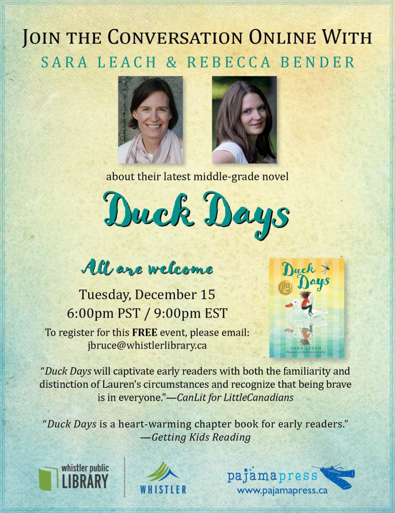Sara Leach is a former teacher, and children’s book author, who lives in Whistler. Her new book, Duck Days, is coming out, and to celebrate, Sara and her illustrator Rebecca Bender (who have worked on three books together but never actually “met”,) will connect through the Whistler Library Zoom, to talk about the process of creating a book. Everyone is welcome – kids and adults.