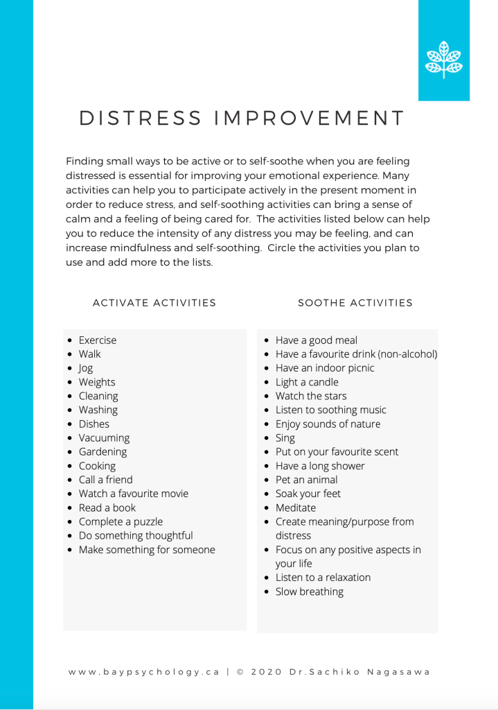 Finding small ways to be active or to self-sooth when you are feeling distressed is essential for improving your emotional experience.