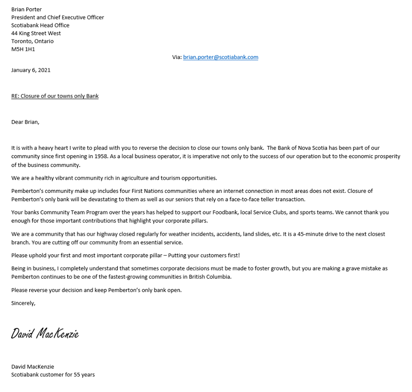 Thanks to David MacKenzie at the Pemberton Valley Lodge for sharing his letter, to help get people started.