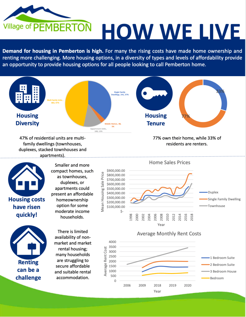 Council’s number one Strategic Priority is to take action on this issue. The Village recognizes that facilitating a range of housing options is essential in creating an inclusive, affordable and livable community in Pemberton.