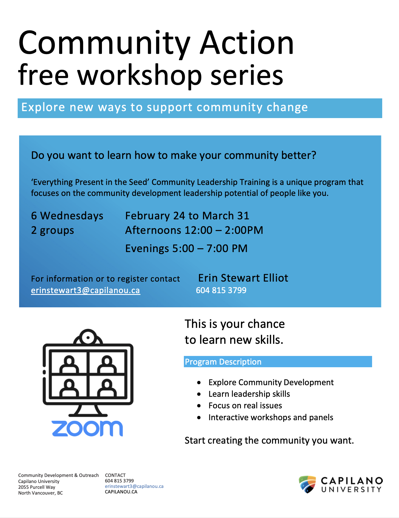 These sessions also lead into a 2 course CapU Community Capacity Building citation. The citation will run September – April (One course each term).