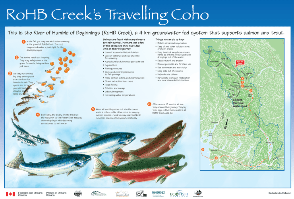Here is a representation of the Coho life cycle in the River of Humble Beginnings, near South Creek. We will introduce Coho first!