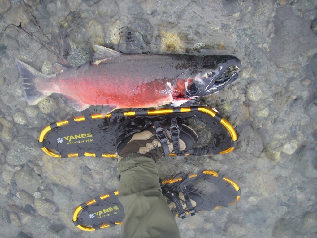 (And no, I didn’t snowshoe up the entire creek. Whenever I am doing spawning surveys, I am very careful where I stepping, making sure to steer clear of redds and I just stepped in to provide a scale for this photo😊).