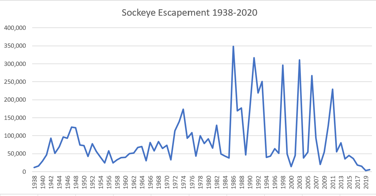 Finally, Sockeye Salmon are the species that people who don’t know anything about fish think of when you say the word ‘salmon’. When spawning, they are bright red with a shiny green head. They can return in huge numbers to their natal streams to spawn, though that is becoming a bit of a rarity these days. Lilwat Nation in conjunction with DFO has been doing spawning surveys for Sockeye for a very long time. The table below shows the size of the run over the period of assessment. You can see there is quite a bit of variability and this is related to life cycle, where you can expect sockeye to be returning to spawn as 3-5 year old fish, with the majority of them in 4-5 year old range, hence a large run every ~5 years. Unfortunately, following the last big run in 2011, the subsequent years have seen some of the lowest returns ever, with 2019 at an all time low of ~2900 sockeye, followed closely by 2020 at 5263. These are alarming numbers, despite large periodic returns seen in the last 20 years. We are so fortunate that Líl̓wat Nation is so invested in keeping good records and working proactively to protect habitat of these returns because drastic action is required in the near term if numbers continue to plummet.