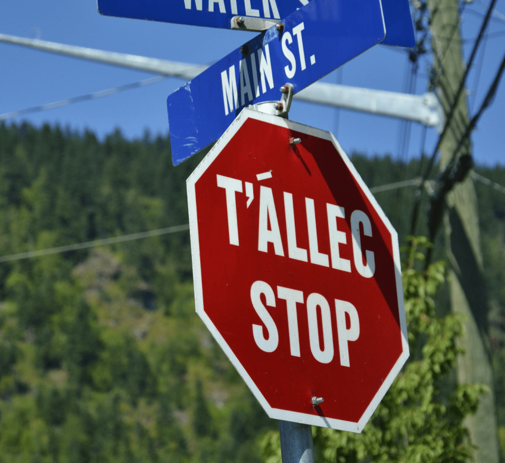 But I have found that something quite remarkable happens when you life your foot off the accelerator and slow down to a careful crawl when you drive down Main Street…. things are no longer a blur. You are not a blur within the beast of your vehicle. The people in the neighbourhood are not a passing blur. You realize, this is a community. You make eye-contact. You nod and smile and acknowledge each other. You might notice that Mr Wallace is out changing up his festive lights. You might notice that the wild cherry trees are budding. You might notice the Stop sign that is also written in Ucwalmícwts, and you might try to sound out the word t̓allec and you might wonder, hmm, how do you say that, and you might even then download the First Voices app and look it up.