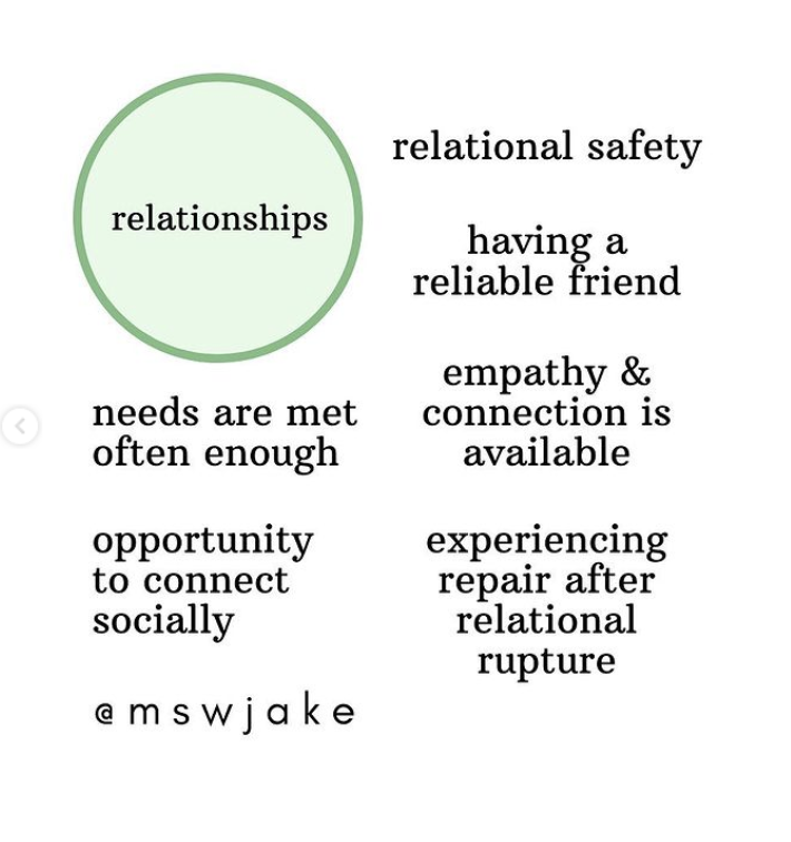 Relationships: Relational safety, having a reliable friend, needs are met often enough, opportunity to connect socially, empathy and connection is available, experiencing repair after relational rupture.