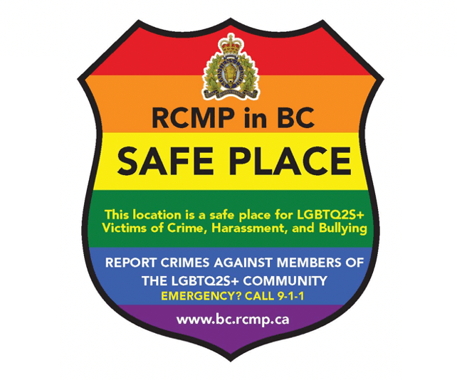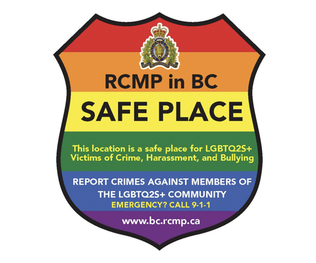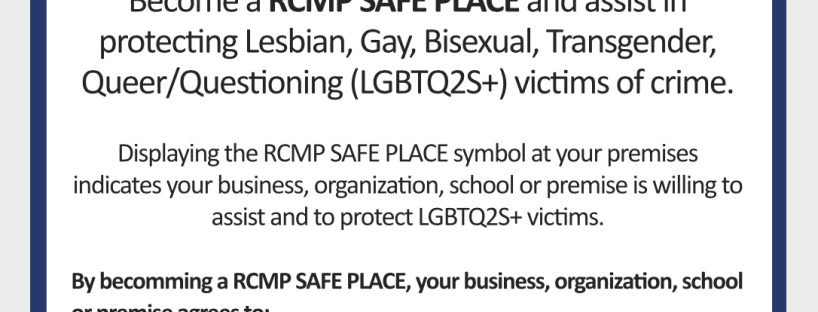 The RCMP Safe Place program involves participating businesses, organizations, schools, and other institutions identifying their premises as a safe haven for Lesbian, Gay, Bisexual, Transgender, Queer/Questioning, Two spirited (LGBTQ2S+) people who are feeling unsafe or are in distress.