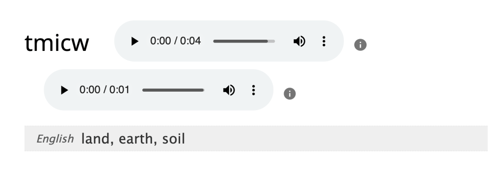 (Interestingly to me, ti tmícwa means the land/earth that is present or known… it’s kind of an equivalent of a possessive noun, of saying, “mine” or “our”, but that’s not technically what it denotes. The land known to us. Not the land we own.