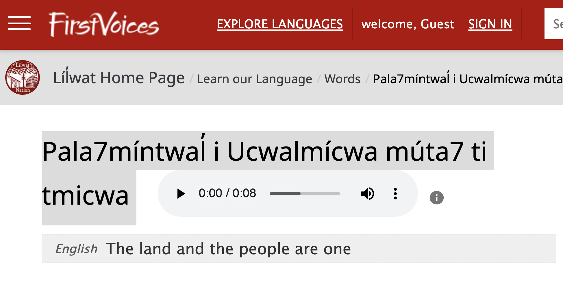 And Pala7míntwal̓ i Ucwalmícwa múta7 ti tmicwa means the land and the people are one.