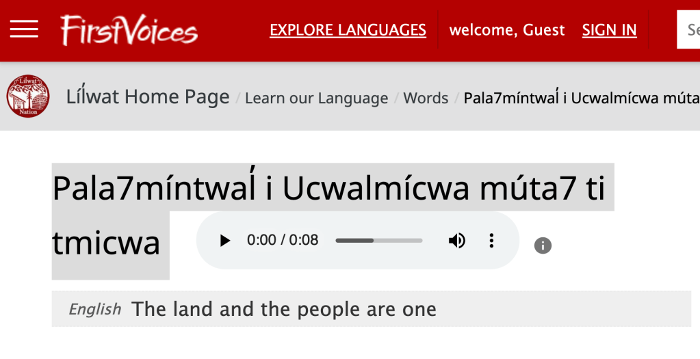 Pala7míntwal̓ is a beautiful word that means “to form one group.” I connect dots here (and stand to be corrected by language speakers), that the people and the land form a wholeness, a unity, a oneness, a kind of family. If you know how to count to ten in Ucwalmicwts, you’ll know that pála7 means one. One thing. One thing are the people and this earth.