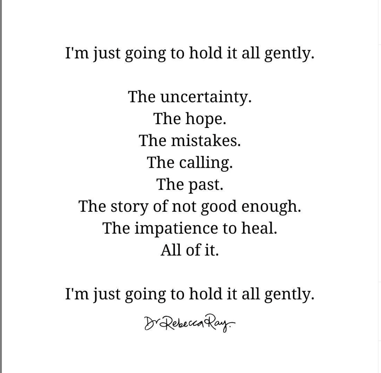 It feels like such a great task to tackle – to learn to hold all the things gently. I have been sitting with the image of all the things I’m holding, imagining them as eggs, all the betrayal, sorrow, hope, ambitions, upheaval, stories… I’m imagining my carrying device – is it a fabric grocery bag? is it my hands? is it something I’ve woven into a basket? – I’m thinking about the way I held my kiddo, the gentle steadiness, the love that poured through me (now I’m 7 years past his infancy, it’s all bled into just love, and the exhaustion and frustration has faded LOL). I’m imagining myself with this kind of gentle-handedness… It makes me feel more gentle towards myself and my frustrations and pettiness and the whole lot.