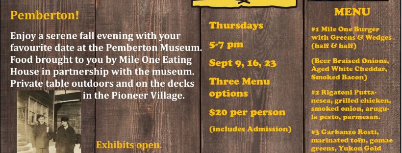 The Pemberton Museum and Mile One Eating House are cooking up something special – September’s Date Night series! Thursdays, from 5pm to 7pm, on September 9, 16, and 23, you can reserve a private table in the Pioneer Village and enjoy one of three delicious Mile One dinners, and a Sparkmouth drink, for just $20 each.