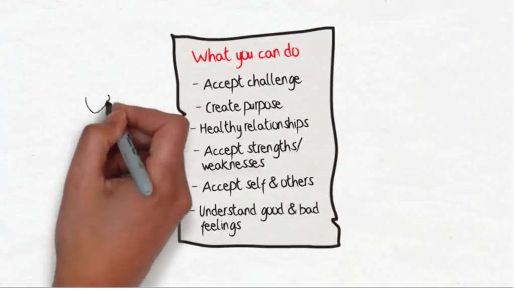 (Below isn’t a full transcript, but some highlights. Listen to the video if you have 6 minutes, it’s a great baseline. Honestly, I was surprised by how simple it is to contribute to your mental health, and yet, I would have been hard-pressed to craft the list of simple things we can do, to help go about it. It’s a real indictment of the cultural waters we’re swimming in that a 46 year old woman needs to be told by a mental health PSA that letting yourself try a new hobby and understanding we all experience good and bad feelings, feels revelatory. Or that in investing energy towards your community, you are cultivating an environment that supports everyone around you to be more mentally healthy!)