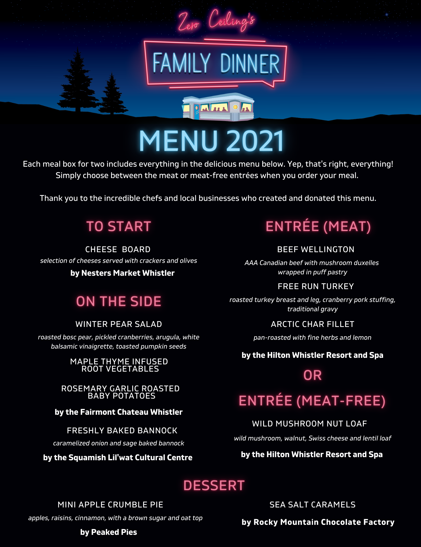 The Family Dinner meal boxes serve two and have been carefully crafted by some of Whistler’s finest chefs at the Hilton Whistler, the Fairmont Chateau Whistler, the Squamish Lil’wat Cultural Centre, Peaked Pies, Rocky Mountain Chocolate Factory and Nesters Market. They come ready to eat: simply pick up in Whistler on Friday December 3 from 4pm – 6pm, warm at home and enjoy with loved ones. Family Dinner is $99 (plus taxes and fees.)