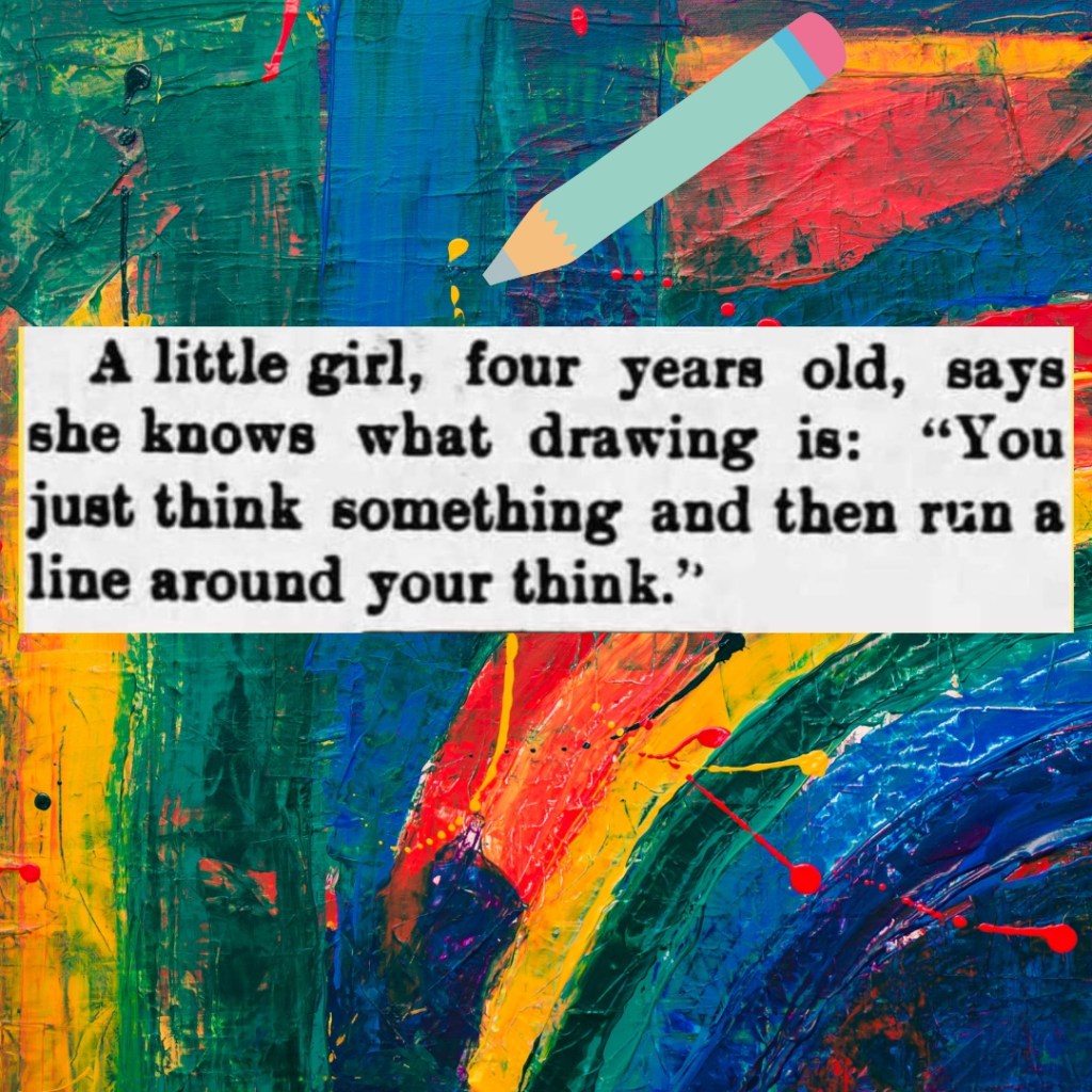 A little girl, four years old, says she knows what drawing is: “You just think something and then run a line around your think.”