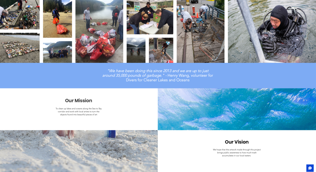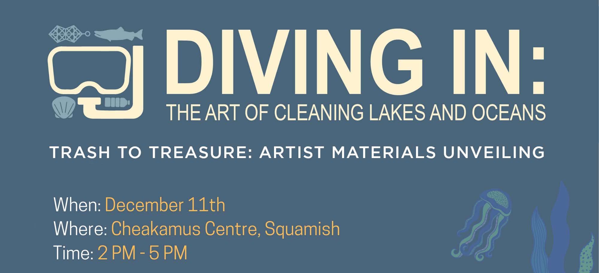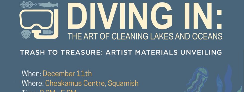 Diving In: The Art of Cleaning Lakes and Oceans is an environmental art campaign that aims to raise awareness of the waste in our lakes and oceans by transforming collected trash into beautiful art. The campaign will be run in collaboration by the Sea to Sky Arts Council Alliance (Pemberton Arts Council, Arts Whistler, the Squamish Arts Council, Lions Bay Arts, The Hearth Arts on Bowen), West Vancouver Arts Council, and North Van Arts. The art council collective will be working with volunteer divers from Divers for Cleaner Lakes and Oceans (DCLO), Return-It, local artists, and school groups.