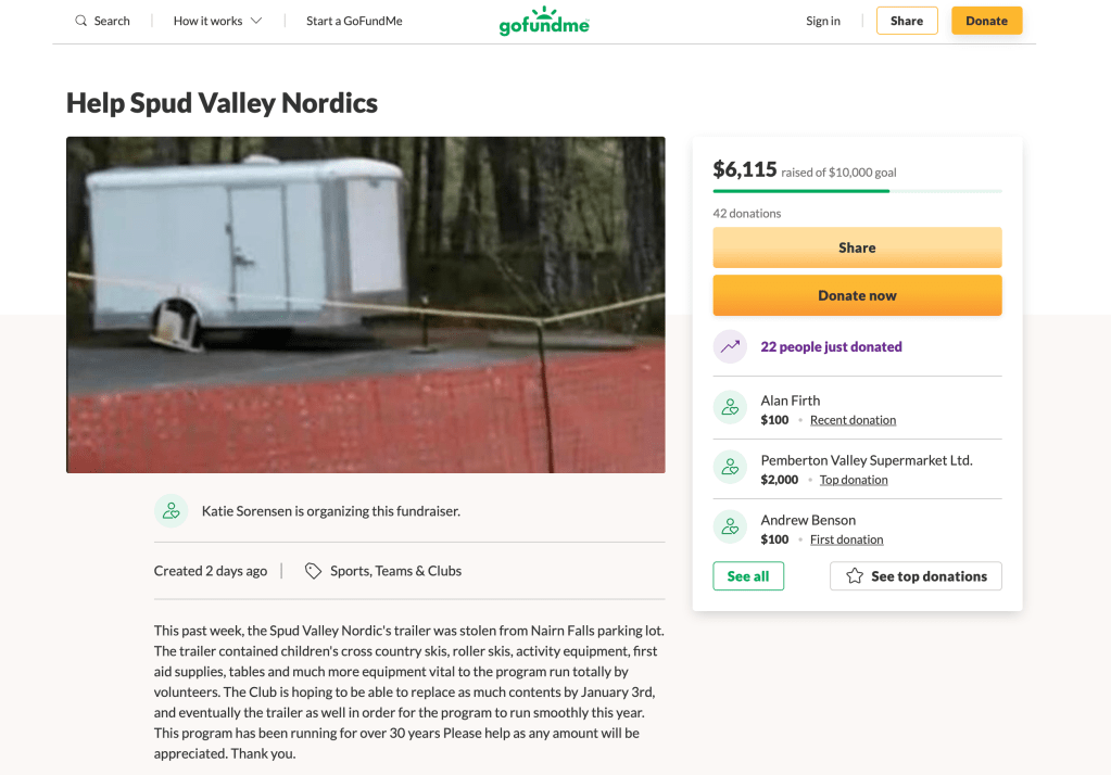 This past week, the Spud Valley Nordic’s trailer was stolen from Nairn Falls parking lot. The trailer contained children’s cross country skis, roller skis, activity equipment, first aid supplies, tables and much more equipment vital to the program run totally by volunteers. The Club is hoping to be able to replace as much contents by January 3rd, and eventually the trailer as well in order for the program to run smoothly this year. This program has been running for over 30 years Please help as any amount will be appreciated. Thank you.