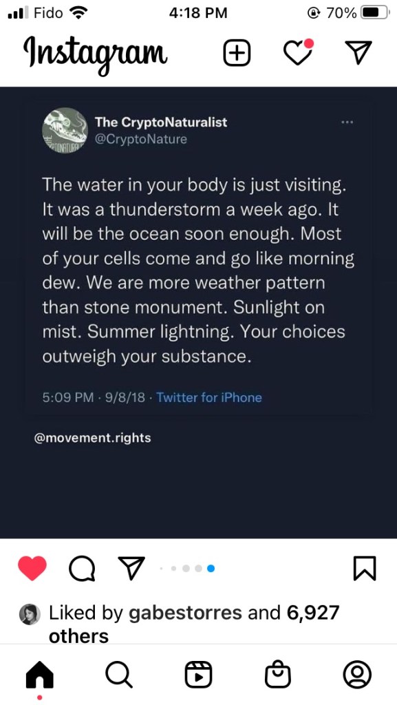Water represents emotion and feelings, in the practices I’ve been exposed to. So this feels as though it speaks not just to the water in my body, but the feelings that flush and flow through it. They too, are more weather pattern than stone monument, especially if I let them flow on through.