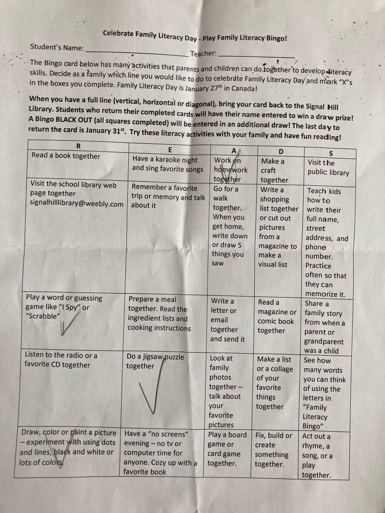 Yesterday, my kiddo came home with a Family Literacy Bingo sheet from school, to support Family Literacy Week.