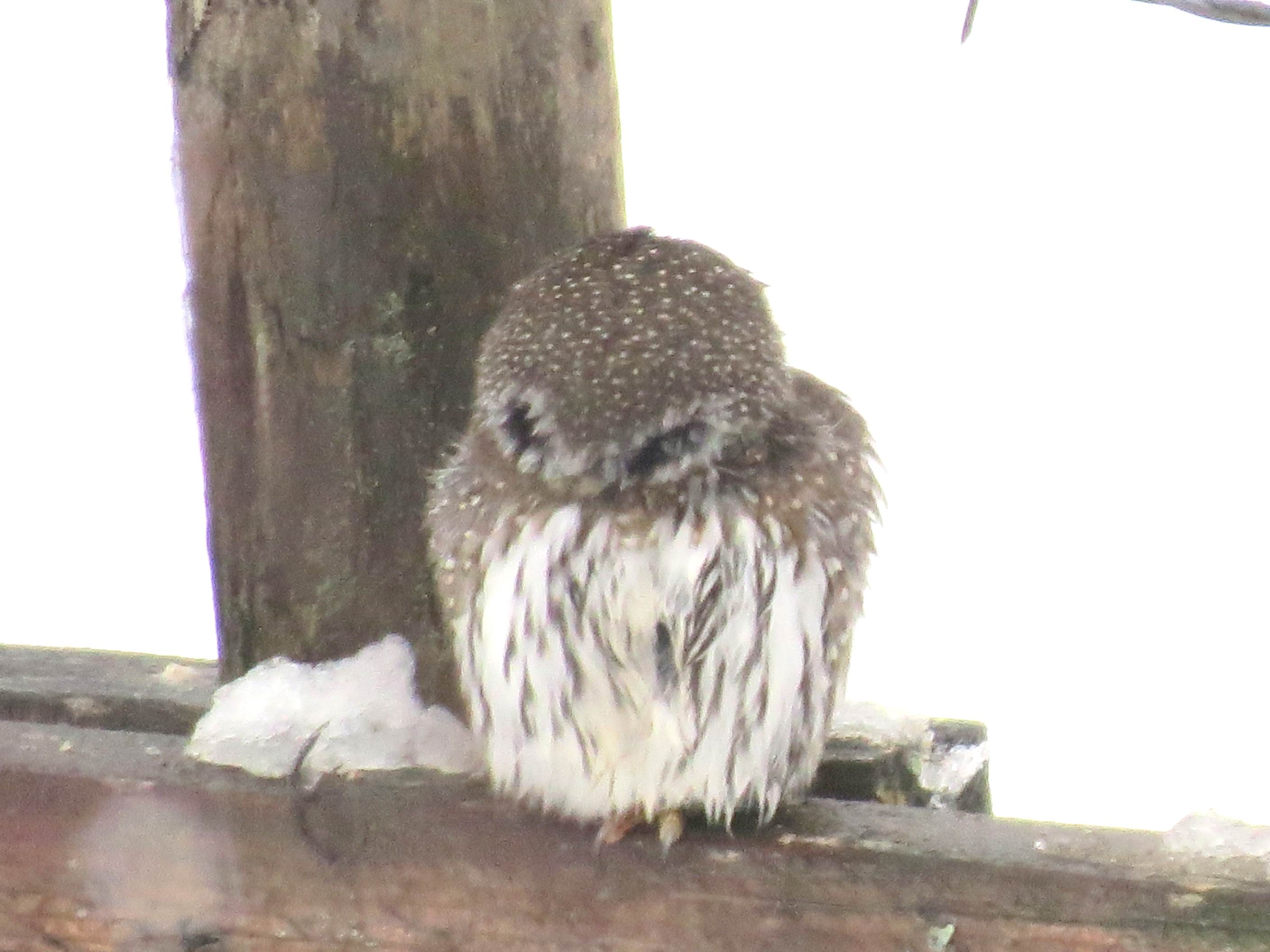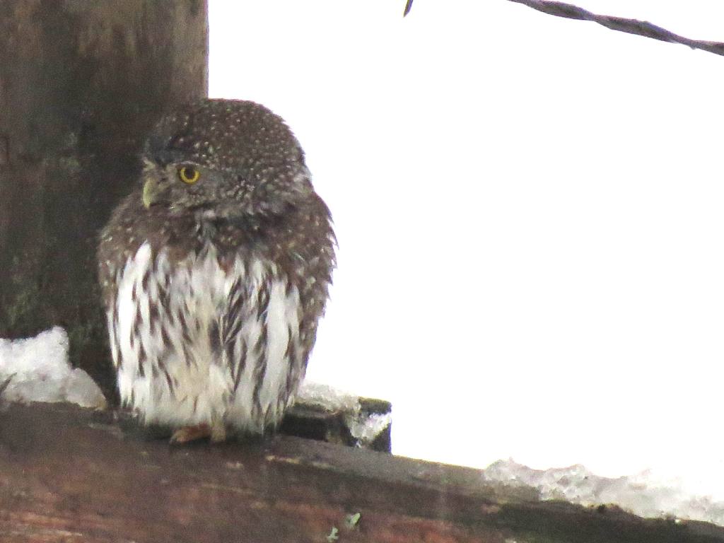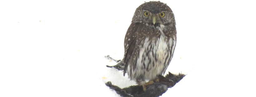 On Wednesday, our dear birding correspondent shared, “While I was twiddling my thumbs in a hospital bed in Vancouver, Sharon, my wife, held the fort in Pemberton. She had an interesting visitor in the shape of a Northern Pygmy Owl. They seem to show up at least once a winter. For a meal it picked a Blackbird . Like most Owls, NPOW can twist the head +180 * . The trick to this Owl is the graphics on the back of the head. As the pictures show, one has to look twice to decide between back and front.“