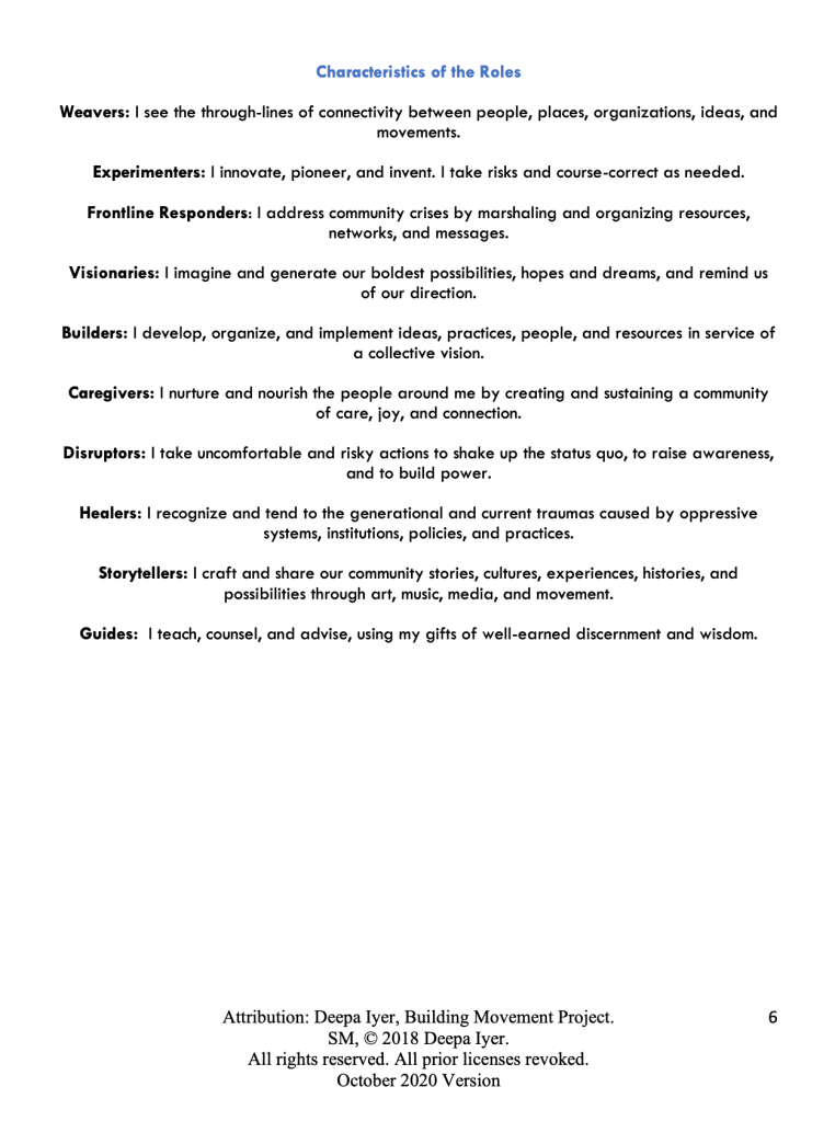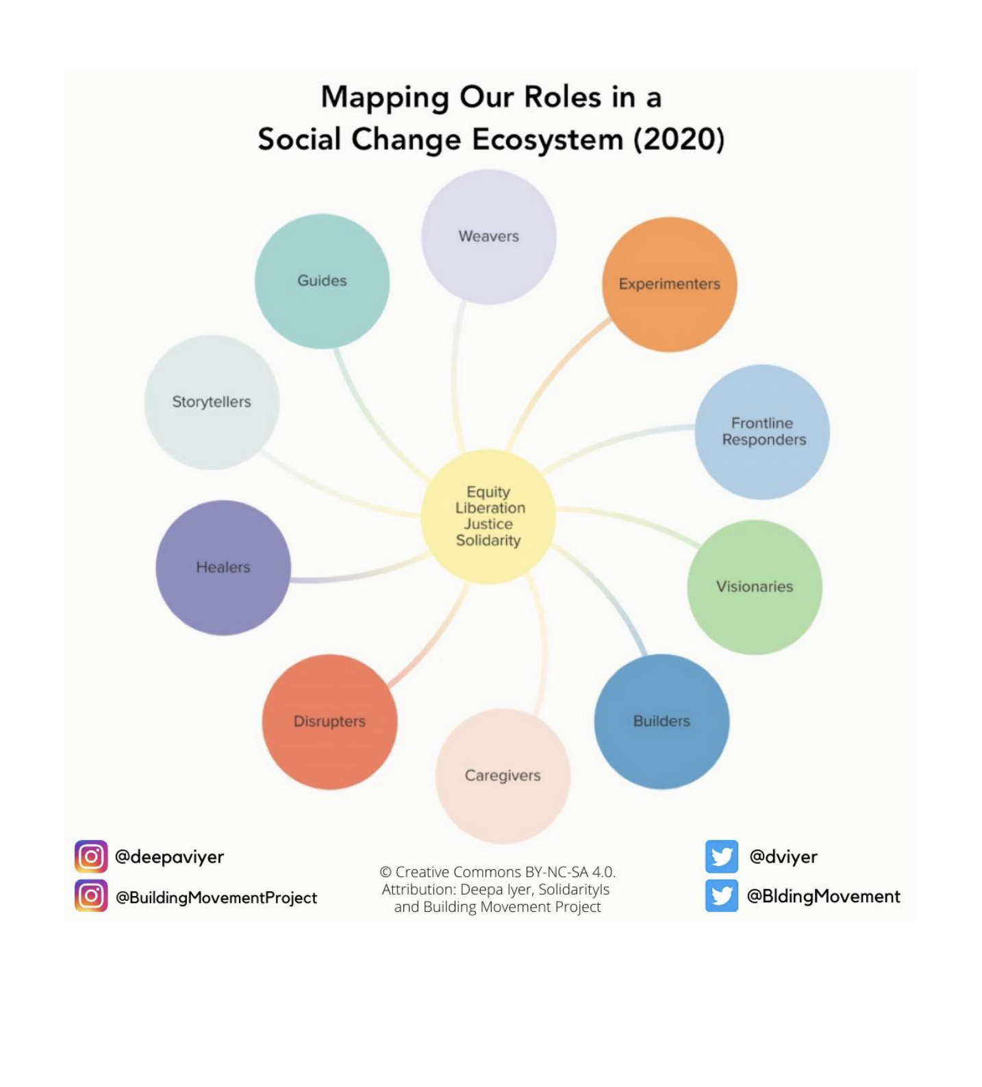 This Social Change Ecosystem map is a cool way of approaching it. It was first developed in 2018 and then renewed in 2020 by Building Movement Project’s Director of Movement Building, Deepa Iyer. She offers a reflection guide, and 3 step framework, that you can use personally, or with a group… explaining that