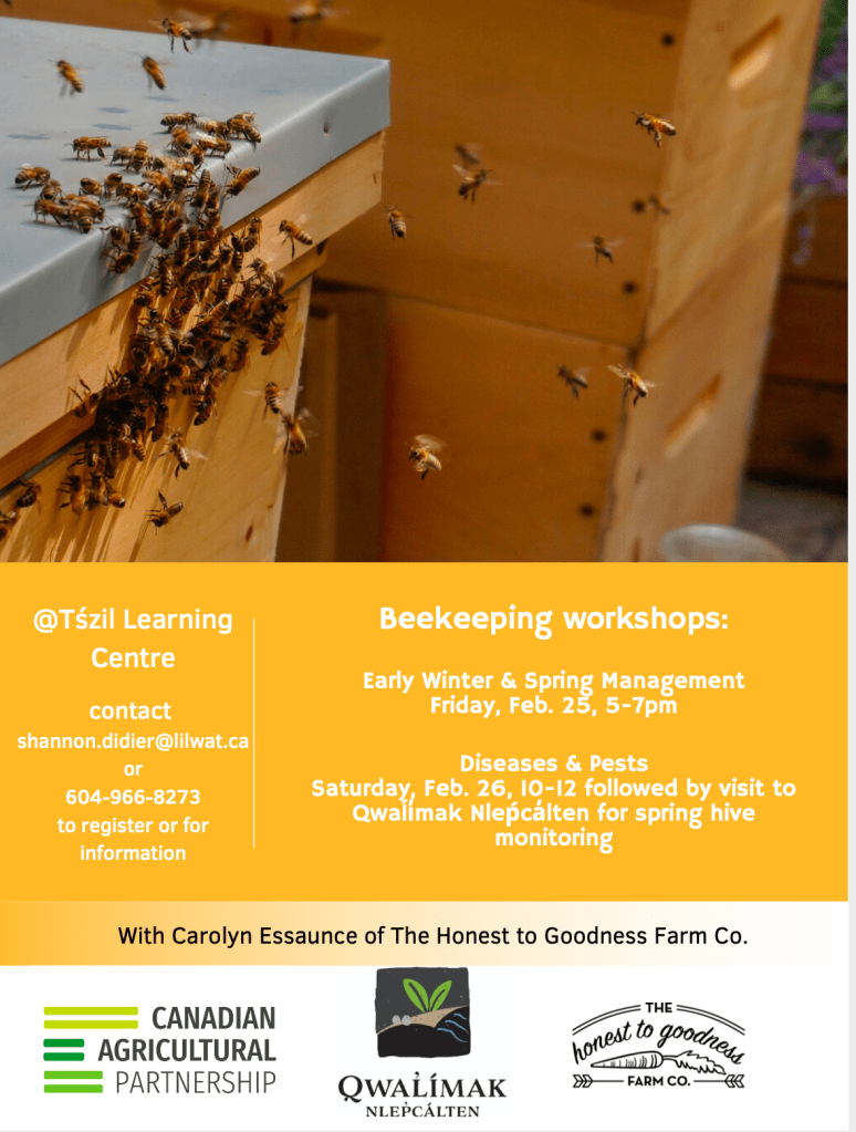 Bee-keepers and the bee-curious, protecting our pollinators is a beautiful thing to do, and requires some savvy. I was lucky enough to attend an earlier workshop in the fall on bee-keeping basics, hosted by Qwalimak Nlepcalten, the Lil’wat Farm, and presented by the incredible bee-keeper Carolyn Essaunce. A second offering is coming up, and will focus on early winter and spring management and diseases and pests… Reach out to Shannon if you’re interested.