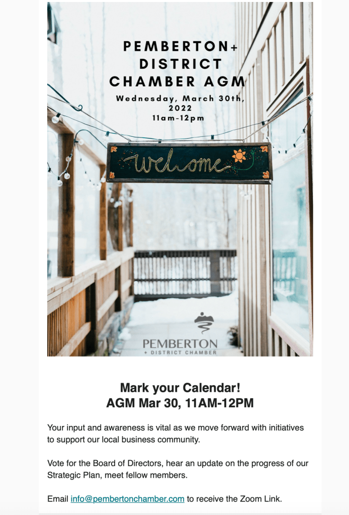 The AGM is coming up at 11am, on March 30 – email for the link. info@pembertonchamber.com