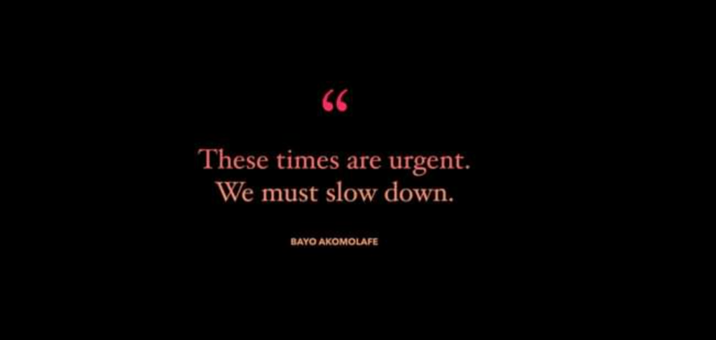 How do we respond to this? Bayo Akomolafe says, “the times are urgent, we must slow down.”