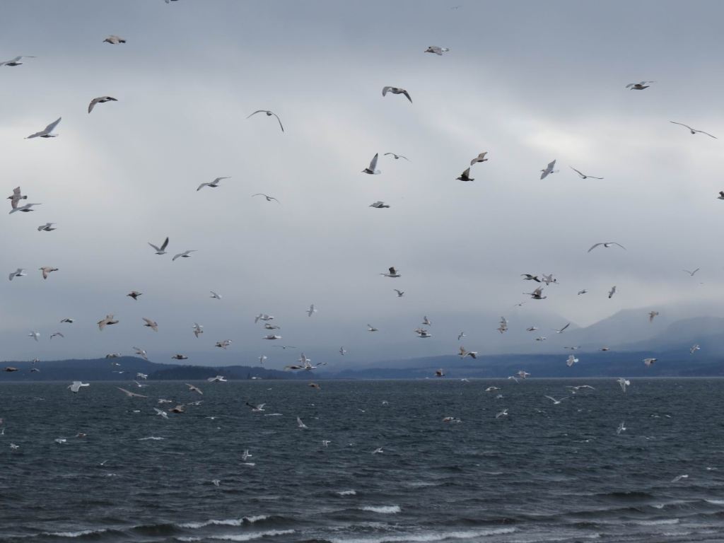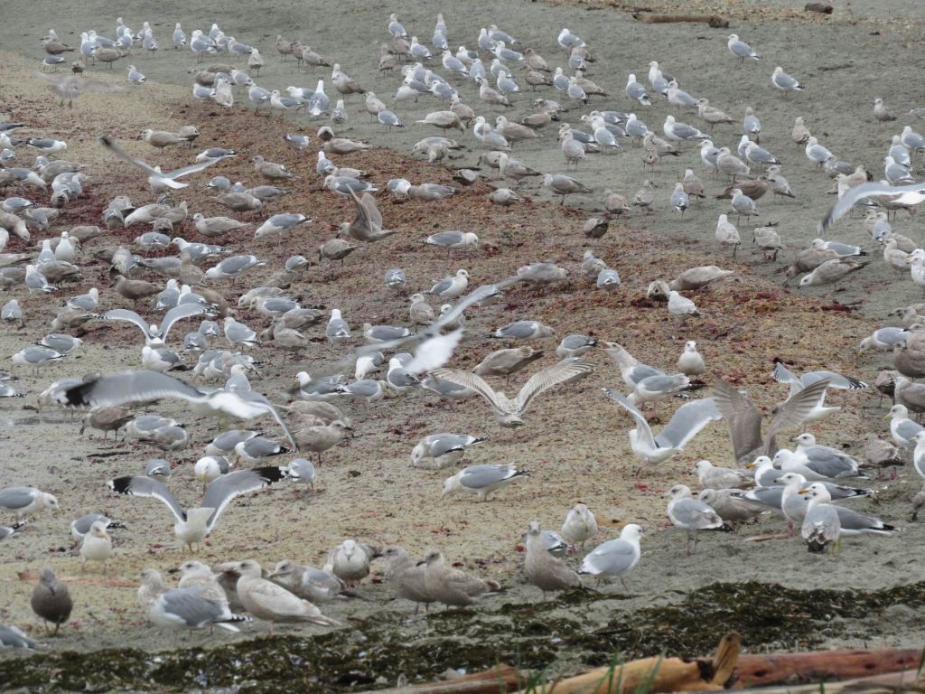 In mid March on the Eastcoast of Vancouver Island a spectacle takes place, which is worth seeing. The Herring Spawn. Millions of Herring come near shore to spawn. This attracts a lot of hungry mouths and beaks. On our last stay in Comox , we were privileged to experience this event. Whales, Sea lions , Seals, Otters and Gulls, they all feast on this bounty. I limit the pictures to the gulls. The light brown matter on shore are Herring eggs. No picture of the Grey Whale, which was feeding next to us.