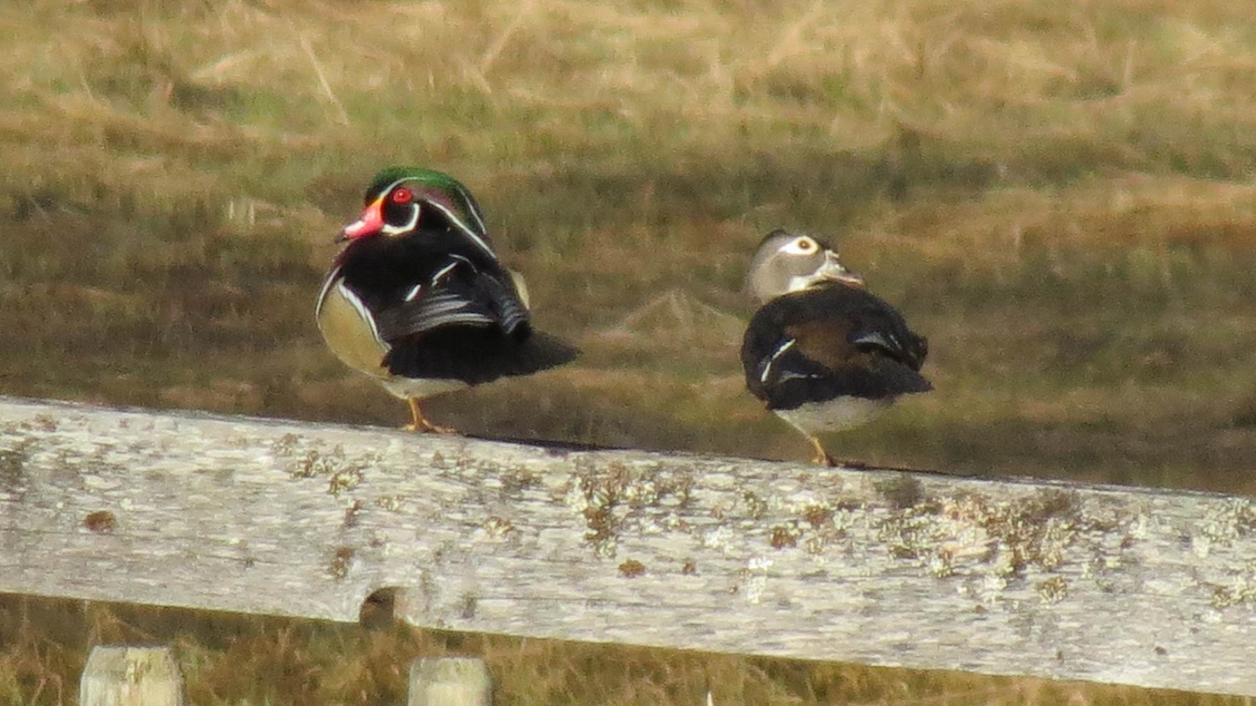 On our return to Pemberton, we were pleased to see most of the snow gone on the field. The puddles attract a lot of ducks, mostly Mallards. Being close to mature Cottonwoods, the Wood ducks show up every year. This couple likes the view from the fence.