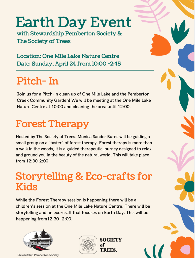 On Sunday, Stewardship Pemberton hosts a Pitch In session, and a free forest therapy taster, (and you can even drop off the kids for storytelling and crafts while you go and commune with the trees.)