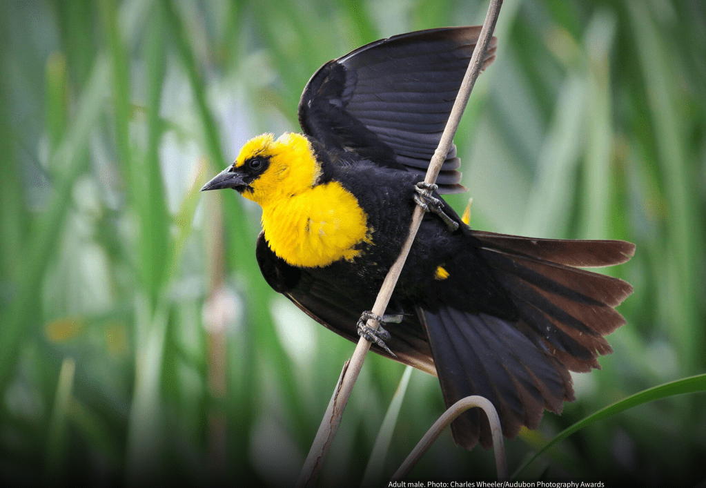 According to https://www.audubon.org/field-guide/bird/yellow-headed-blackbird, where I borrowed this striking close up photo, “The male Yellow-headed Blackbird is impressive to see, but not to hear: it may have the worst song of any North American bird, a hoarse, harsh scraping. Yellow-heads nest in noisy colonies in big cattail marshes of the west and midwest; when not nesting, they gather in flocks in open fields, often with other blackbirds. At some favored points in the southwest in winter, they may be seen in flocks of thousands.”