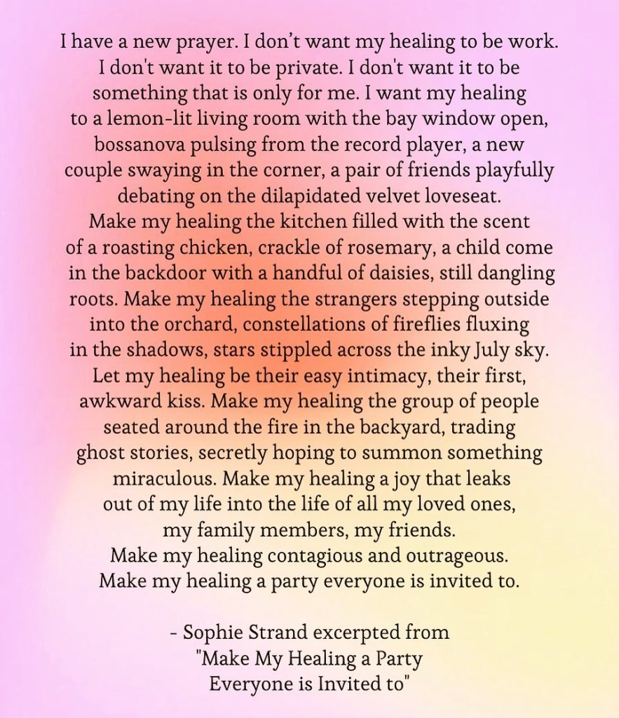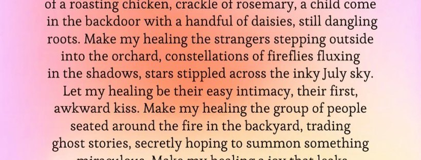 I have a new prayer. I don’t want my healing to be work. I don’t want it to be private. I don’t want it to be something that is only for me. I want my healing to be a lemon-lit living room with the bay window open, bossanova pulsing from the record player, a new couple swaying in the corner, a pair of friends playfully debating on the dilapidated velvet loveseat. Make my healing the kitchen filled with the scent of a roasting chicken, crackle of rosemary, a child come in the backdoor with a handful of daisies, still dangling roots. Make my healing the strangers stepping outside into the orchard, constellations of fireflies fluxing in the shadows, stars stippled across the inky July sky. Let my healing be their easy intimacy, their first, awkward kiss. Make my healing the group of people seated around the fire in the backyard, trading ghost stories, secretly hoping to summon something miraculous. Make my healing a joy that leaks out of my life into the life of all my loved ones, my family members, my friends. Make my healing contagious and outrageous. Make my healing a party everyone is invited to.