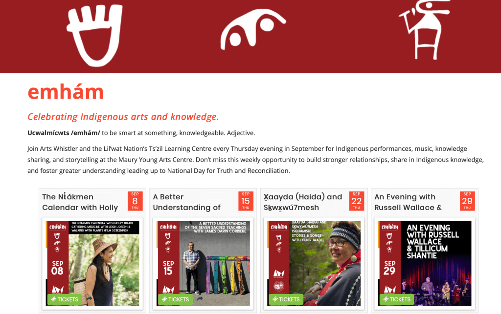 Join Arts Whistler and the Lil’wat Nation’s Ts’zil Learning Centre every Thursday evening in September for Indigenous performances, music, knowledge sharing, and storytelling at the Maury Young Arts Centre.